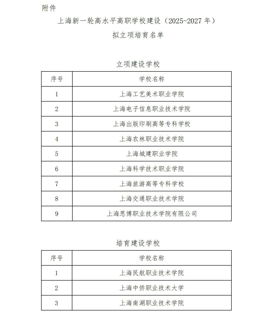 關(guān)于上海新一輪高水平高職學校建設(shè)(2025-2027年)擬立項培育名單的公示