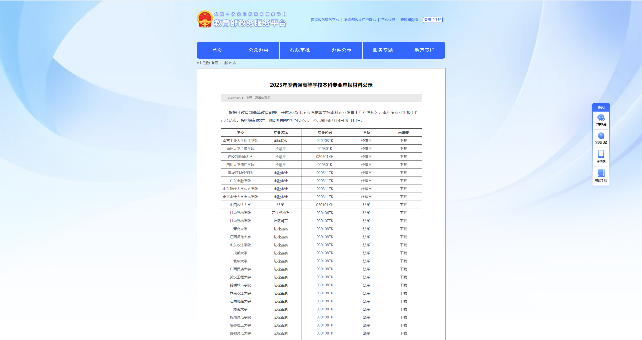 8月14日,教育部發(fā)布《2025年度普通高等學(xué)校本科專業(yè)申報(bào)材料公示》。根據(jù)《教育部高等教育司關(guān)于開展2025年度普通高等學(xué)校本科專業(yè)設(shè)置工作的通知》,本年度專業(yè)申報(bào)工作已經(jīng)結(jié)束。